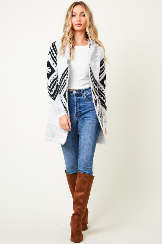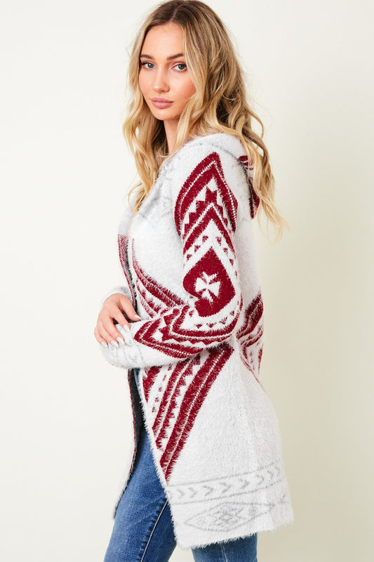 Aztec Pattern Hooded Fluffy Yarn Sweater Long Sleeve Open Front Cardigan