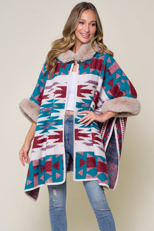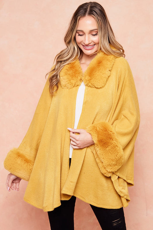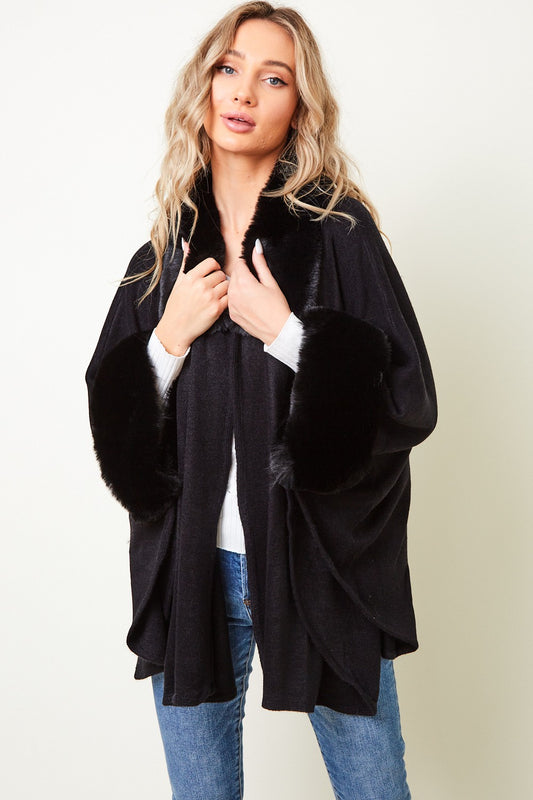 Batwing Sleeve Faux Fur Trimmed Poncho Sweater Cape