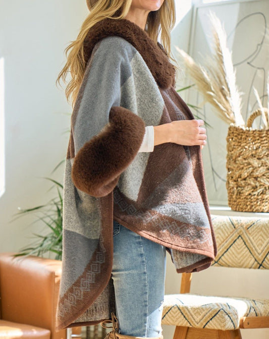 Brown Taupe & Grey Vertical Stripe Faux Fur Trim Cape Poncho