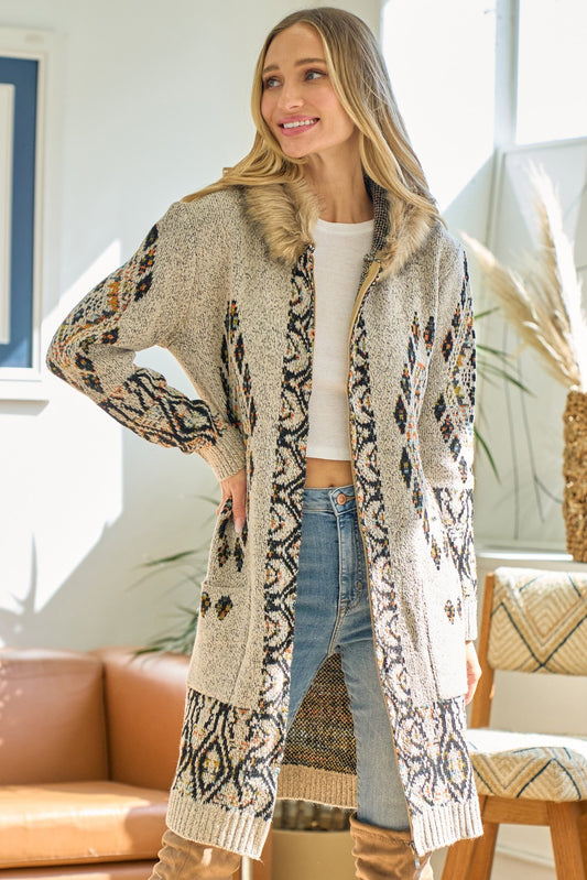 Aztec Pattern Long Sleeve Faux Fur Trim Hoodie Knit Cardigan Sweater
